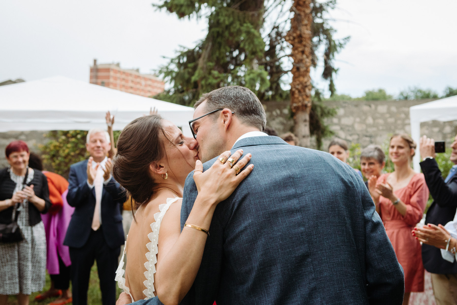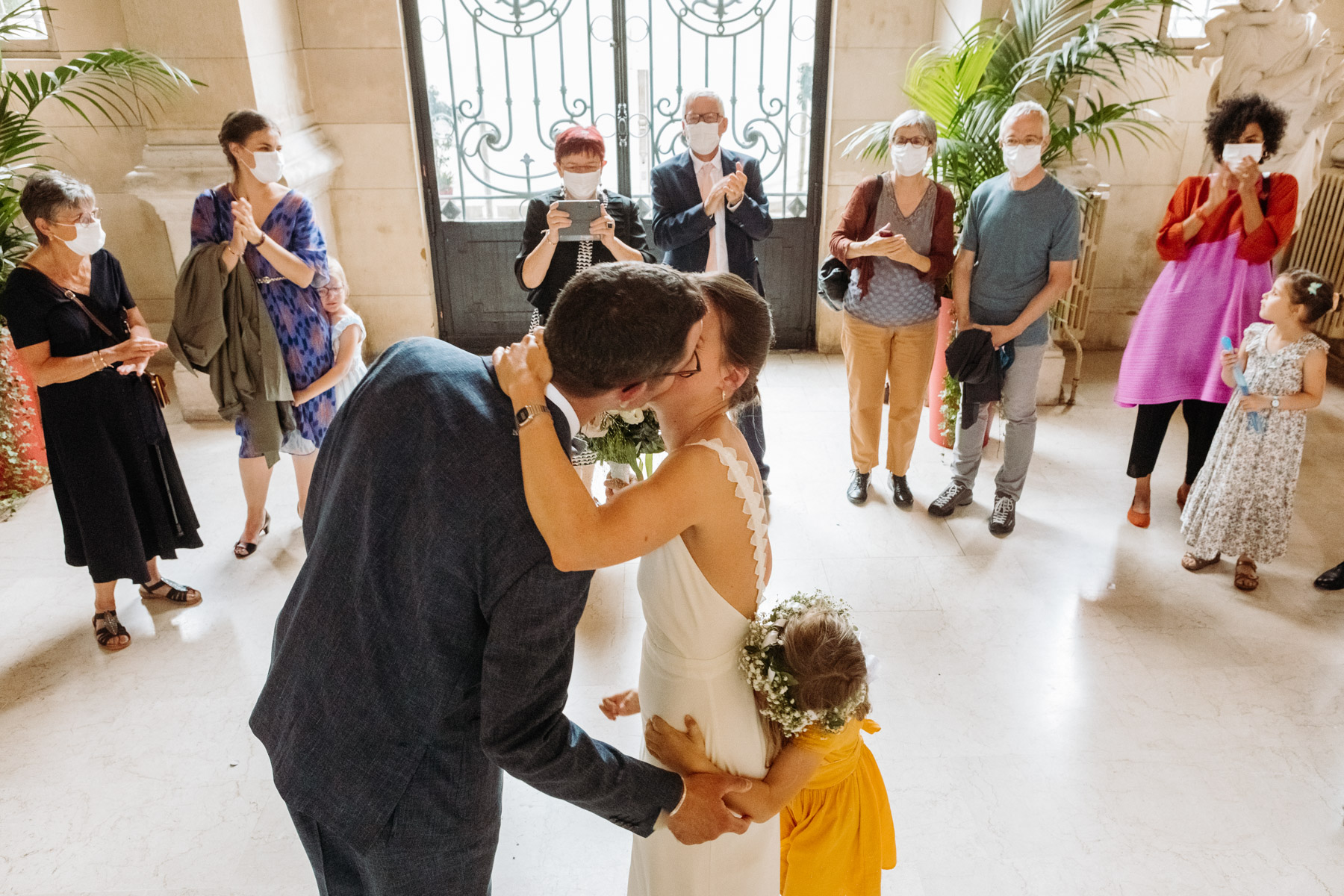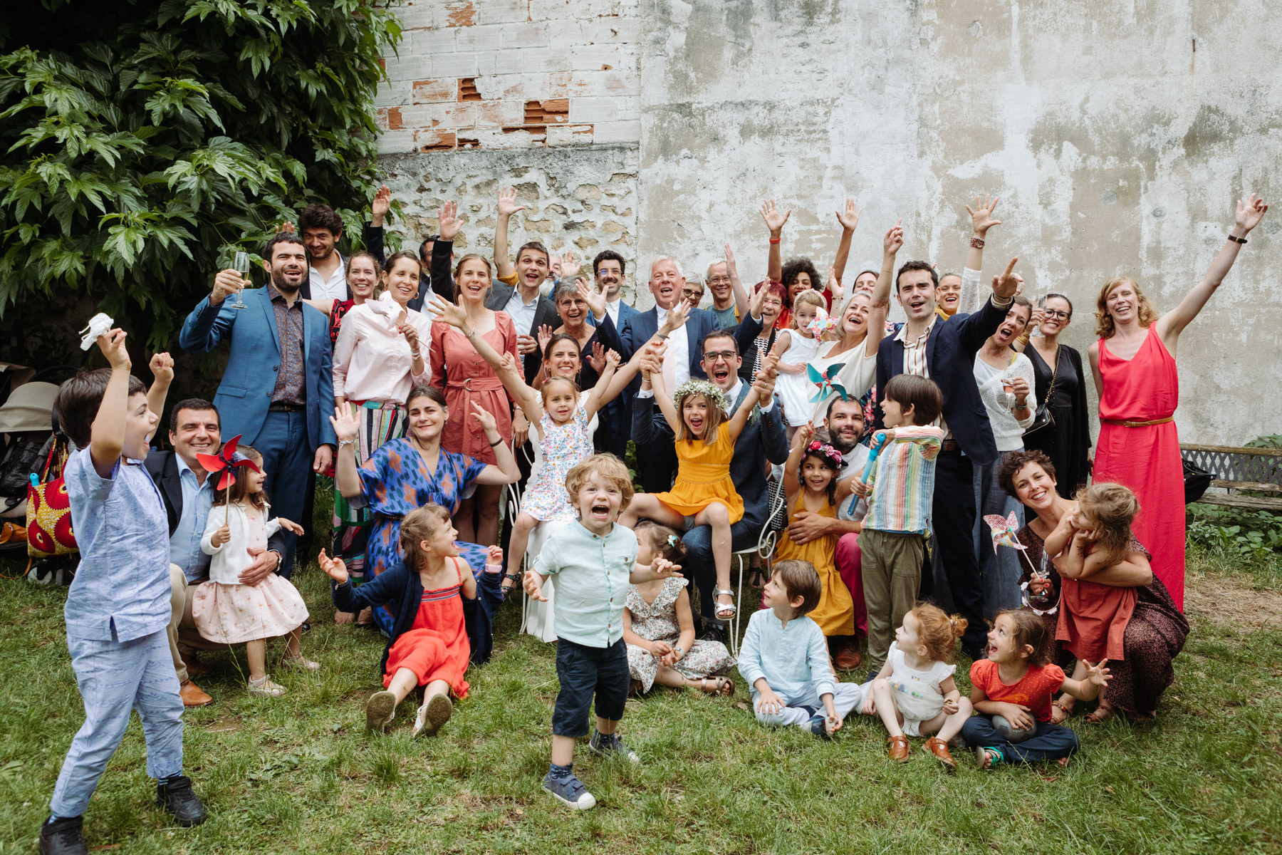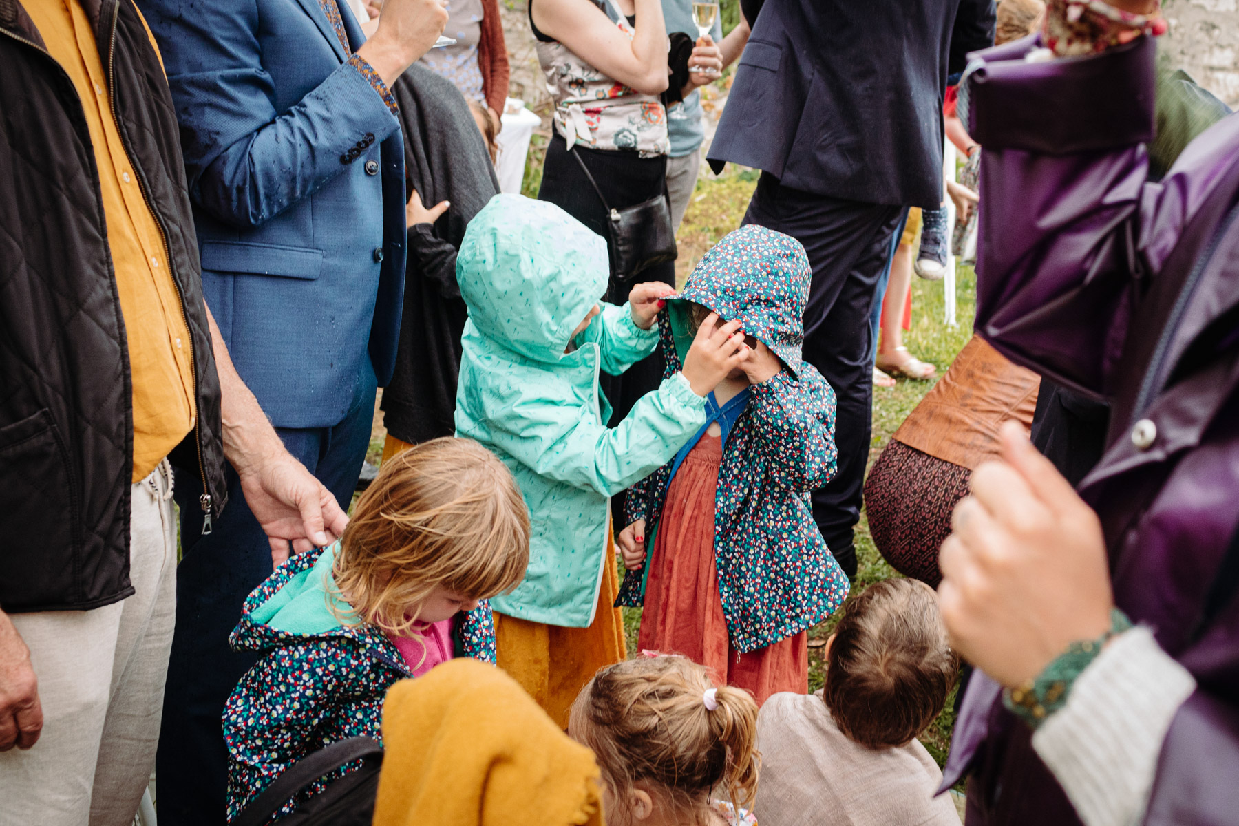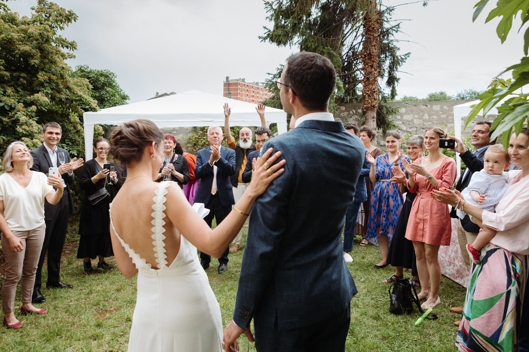 Claire et Camille ont opté pour la simplicité dans l’organisation de leur mariage : cocktail maison, jeux pour enfants, barnum pour la pluie, enceintes bluetooth pour la musique… Et restrictions sanitaires obligeant, un petit comité constitué d’autant d’adultes que d’enfants était au rendez-vous.